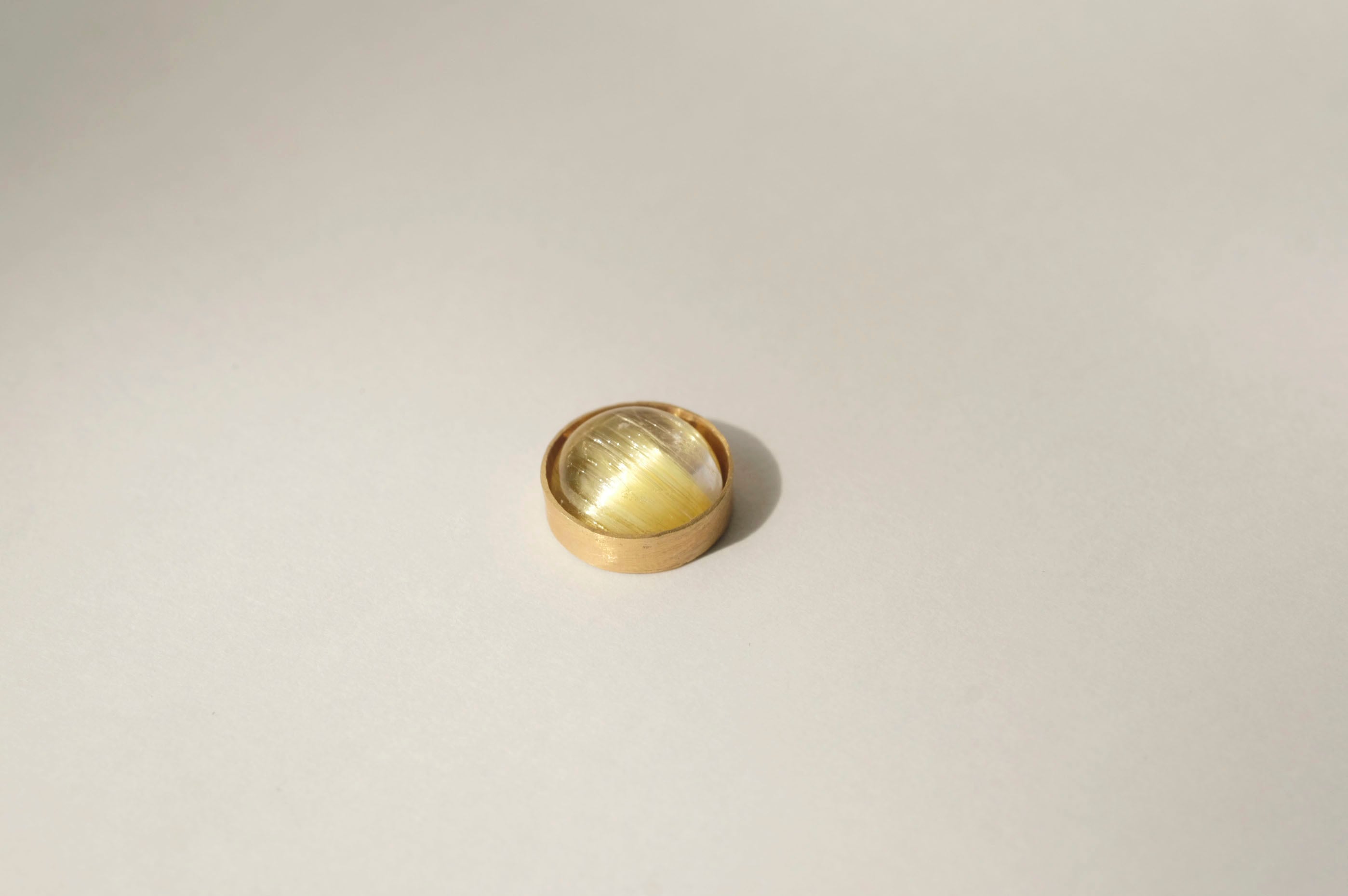 水晶の中に金色のルチルが繊細に走る、美しい天然石。光の角度によってキャッツアイのような輝きが現れ、内側から光を放つような神秘的な表情を見せます。