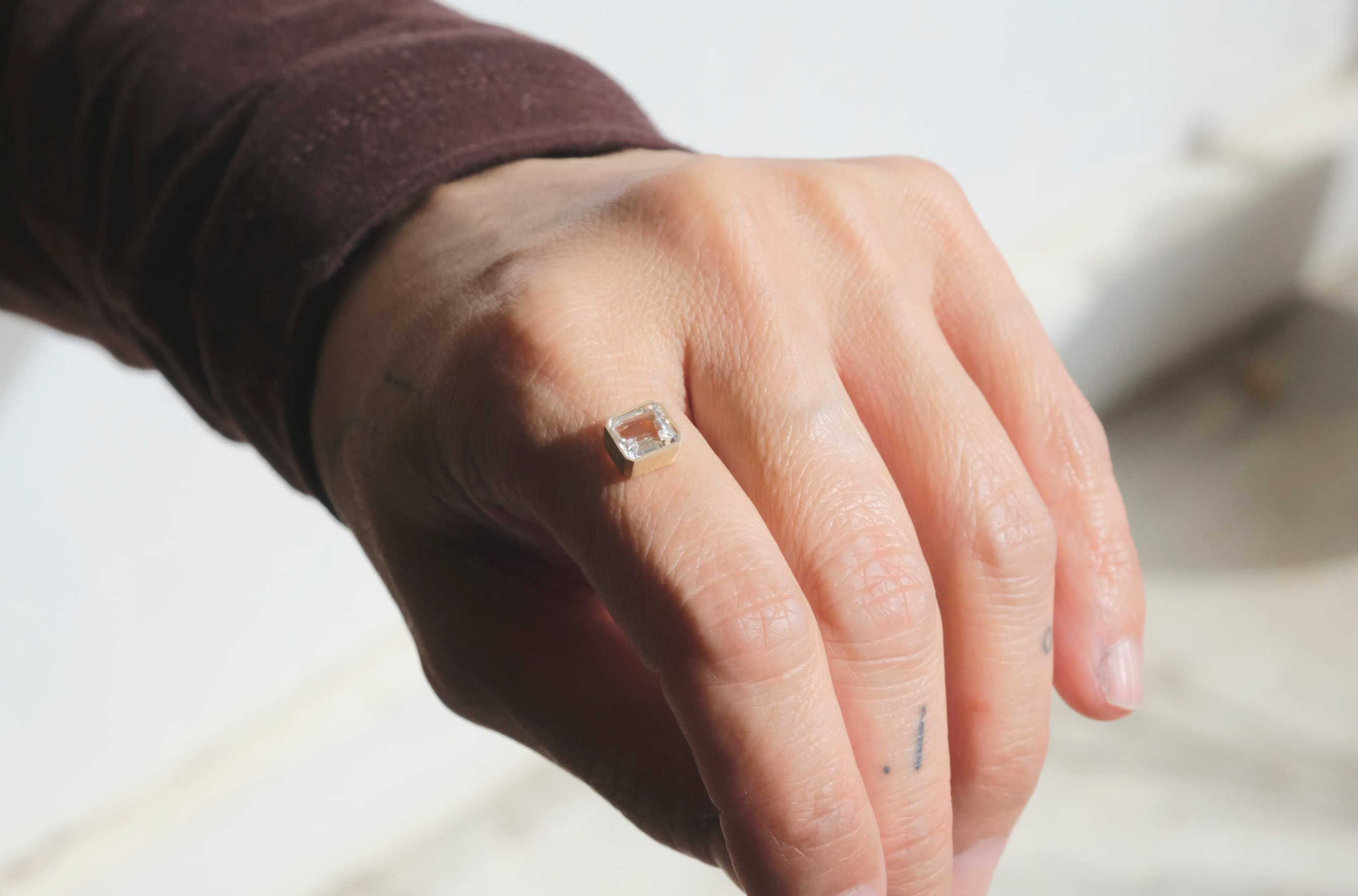 エメラルドカットによって石の内部の透明感と奥行きが際立ち、静かで上品な輝きを放ちます。
