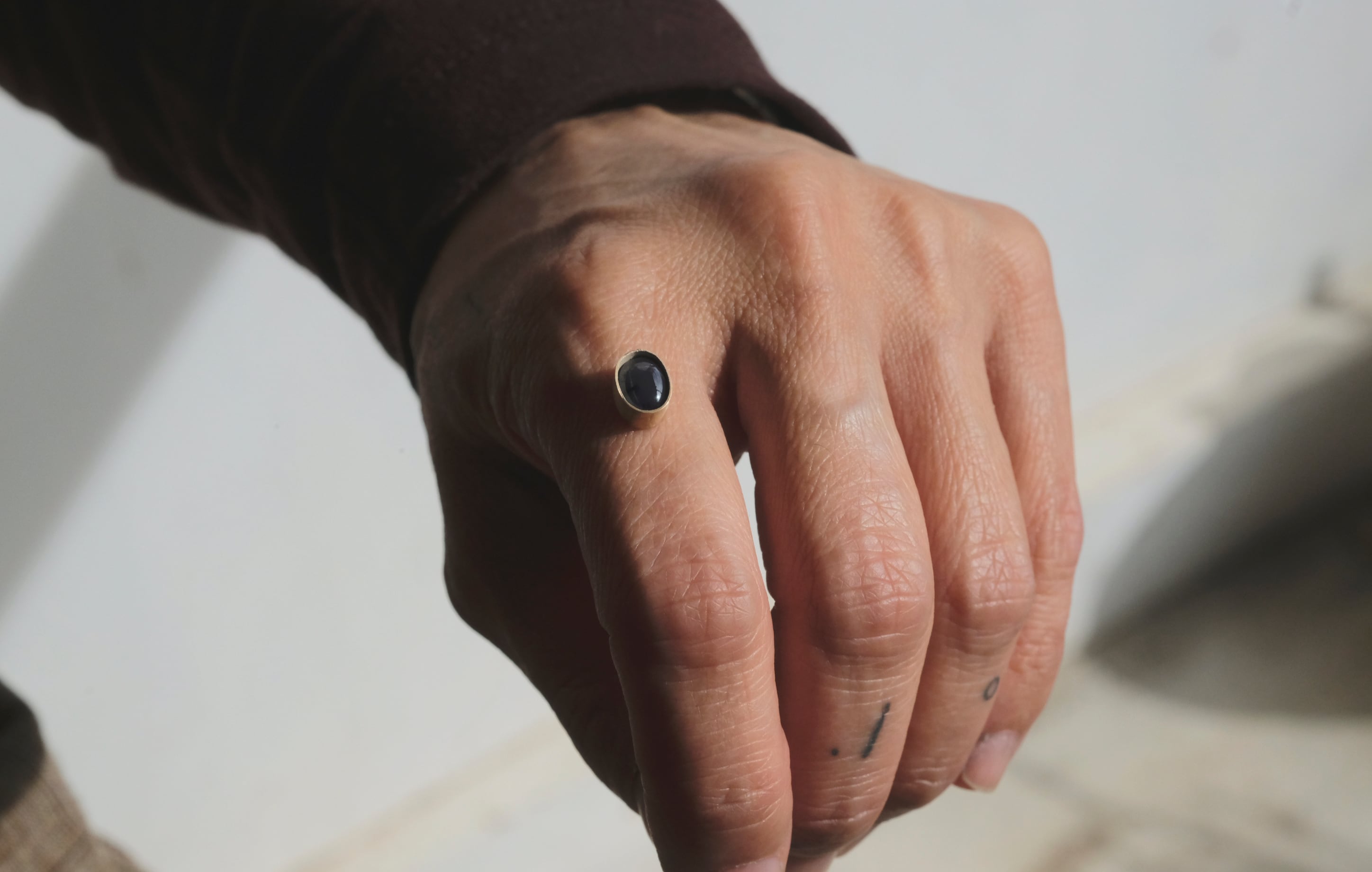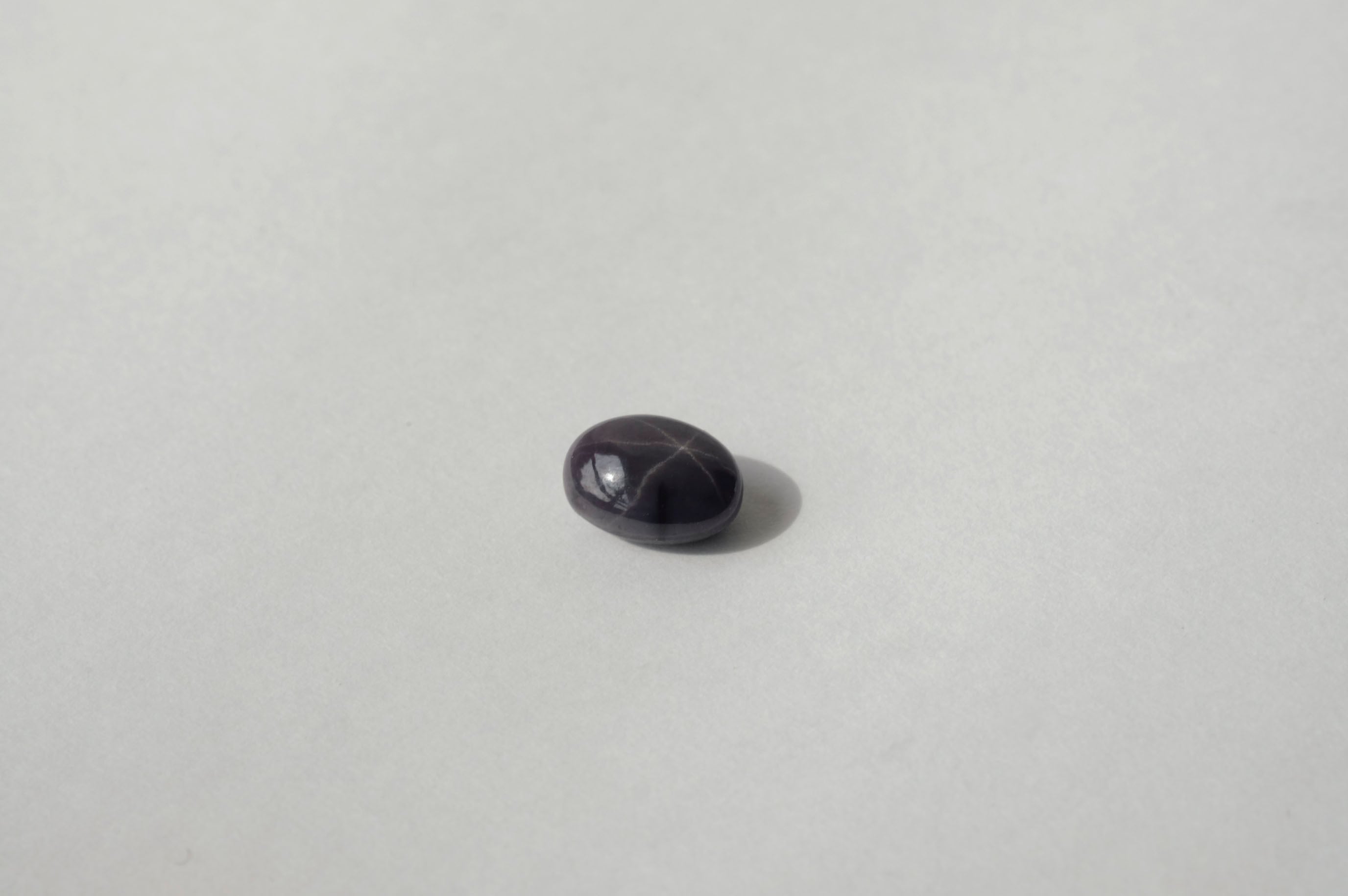 深い色の中に、星の光が浮かび上がるスタースピネルのルースになります。
